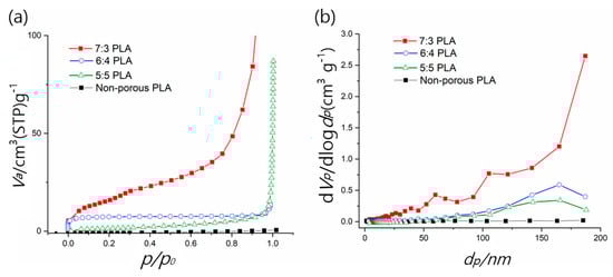 (a) N2 adsorption isotherms and (b) pore size distribution (BJH) plots of non-porous and porous PLA fibers (5:5, 6:4, and 7:3 PLA).