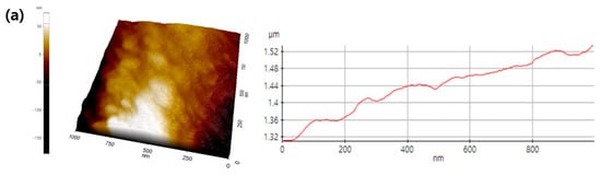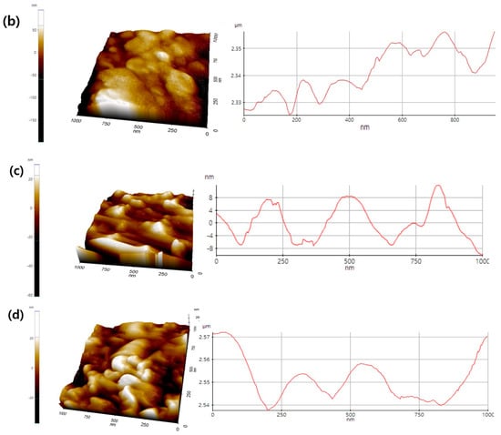 To investigate the effect of polymer–solvent systems on roughness or pore depth, we analyzed AFM images and discovered that nano-sized pores interconnected regularly on the surface of PLA fibers, as shown in Figure 4. The measurements of roughness of all PLA fibers and corresponding mean values are depicted in Figure 4. The mean roughness value of non-porous PLA fibers was approximately less than 5 nm, while that of porous 7:3 PLA increased over 100 nm. As observed in the SEM images and BET analysis, the pore depth and surface area in 7:3 PLA had a high magnitude. Phaechamud and Chrtrattha have reported that high viscosity liquids promote the formation of high pore sizes [24]. Moreover, the increased viscosity results in increased coarsening time, leading to the formation of large pores and interpenetrating network structures of PLA fibers [25]. In Table 1, 7:3 PLA had the highest viscosity of 252 mPa·s in the DCM:AC polymer–solvent systems, the interpenetrating network structure with the largest pore size and depth, as shown in Figure 4d.