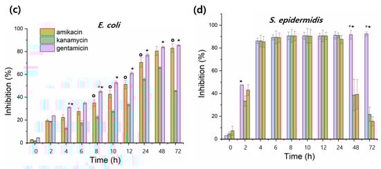 Antibacterial kinetic growth curves and inhibition (%) of non-porous PLA (control) and AD-loaded porous 7:3 PLA against (a,c) E. coli and (b,d) S. epidermidis; two-way ANOVA: o p < 0.05 amikacin versus kanamycin; ★ p < 0.05 kanamucin versus gentamicin; # p < 0.05 amikacin versus gentamicin.