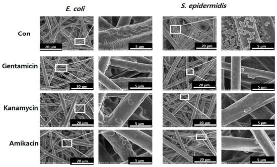 PLA granules were purchased from Goodfellow (Goodfellow Cambridge Limited, Huntingdon, UK). Gram-negative strain Escherichia coli (E. coli, KCTC 1039) and Gram-positive strain Staphylococcus epidermidis (S. epidermidis, KCTC 13172) were obtained from Korean Collection for Type Cultures (KCTC, Jeongyep-si, Korea). Kanamycin disulfate salt from Streptomyces kanamyceticus, gentamicin sulfate, amikacin, phosphate-buffered saline (PBS, pH 7.4), sodium chloride, tryptic soy broth, LB Broth, dichloromethane (DCM), acetone (AC), chloroform, ethyl alcohol (EtOH), ninhydrin, acetic acid, and osmium tetroxide (4% w/v) were purchased from Sigma-Aldrich (St. Louis, MO, USA). Tryptic soy agar and MacConkey sorbitol agar were purchased from Becton Dickinson (BD Difco™, Sparks, MD, USA).