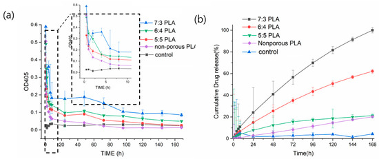 In vitro release profiles of gentamicin-loaded non-porous and porous 5:5, 6:4, and 7:3 PLA fibers for 7 d, (a) OD405 curves and (b) cumulative release profiles.