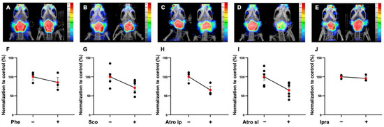 Representative MIP images and normalized quantification of microSPECT/CT biodistribution of [99mTc]TcO4− in parotid glands at 45 min after injection in non-tumor-bearing mice premedicated with phenylephrine (Phe) 5 mg kg−1 ip (A,F), scopolamine (Sco) ip 5 mg kg−1 (B,G), atropine (Atro) ip 15 mg kg−1 (C,H), atropine sl 15 mg kg−1 (D,I), or ipratropium sl 4 mg kg−1 (E,J). Red points represent the mean ± SEM; black points represent the sample dispersion. (Statistical test has been performing using paired t-test.