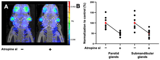 Mice were treated by different drugs, routes of administration, and doses as described in Table 1. Anticholinergic drugs (atropine, scopolamine, and ipratropium) and an α-adrenergic drug (phenylephrine) were evaluated. Depending on the used molecules, the intraperitoneal (ip) or sublingual (sl) routes were assessed. Intraperitoneal injection was performed 15 min before the radiotracer administration. Sublingual administration consisted of placing a compress impregnated with 50 µL of the corresponding drug in the oral cavity 15 min before the radiotracer administration, which was renewed at 15 min for a total impregnation duration of 30 min.