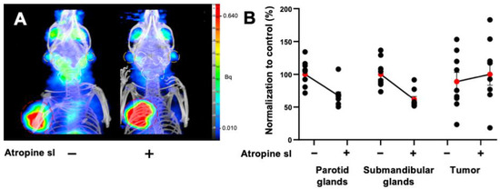 A 30% decrease was also observed in the salivary glands of LNCaP xenografted mice (parotids: PV: −26.8%, p < 0.0001; n = 9; submandibular glands: PV: −37.6%; p < 0.0001; n = 9). The tumor [68Ga]Ga-PSMA-11 PET signal was increased by 18% following sublingual atropine when compared to control (p = 0.012; n = 9) (Figure 3A,B). PET quantification data are summarized in the Table 4.