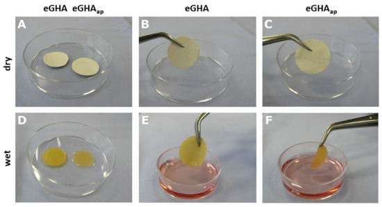 Photographs of electrospun gelatin/hydroxyapatite scaffolds with (eGHAap) and without additional porosity (eGHA). The scaffolds were punched in circles after drying (A–C) and subsequently rewetted with culture medium (D–F). (A–C) If dry, there was no remarkable macroscopic difference between eGHA and eGHAap (A, left: eGHA, right: eGHAap) apart from the slightly papery appearance of eGHAap (C) when compared with that of eGHA (B). (D–E) Following wetting and moisture expansion, eGHA appeared clearly thicker (D, left) and inherently more stable (E), while eGHAap collapsed if taken with forceps (F) but remained in shape and easily unfolded if laid down (D, right).