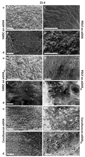 It was then tested whether the scaffolds could be populated by hMSCs, PDLFs, or interactive cocultures of both cell types. As described above, 1 × 105 cells of each type were transferred to the nonwovens. After 10 d or 21 d for hMSCs and PDLFs, respectively, the samples were prepared for scanning electron microscopy (SEM) analysis. The corresponding SEM micrographs are depicted in Supplementary Figure S4 (analysis after 10 d) and Figure 2 (analysis after 21 d). Figure 2A represents the hMSC-populated eGHA scaffold from the top side (u), where the cells were placed, and Figure 2B represents it from the bottom side (d), which faced the culture dish. By analogy, Figure 2C,D shows the PDLF-populated eGHA scaffolds. hMSC-populated eGHAap nonwovens are depicted in Figure 2E,F; PDLF-harboring eGHAap specimens are shown in Figure 2G,H. Figure 2I–L shows SEM pictures of interactive cocultures of hMSCs and PDLFs (Figure 2I,J: eGHA; Figure 2K,L: eGHAap); hMSCs are shown in Figure 2I),K and PDLFs are depicted in Figure 2J,L. The same system is used in Supplementary Figure S4.