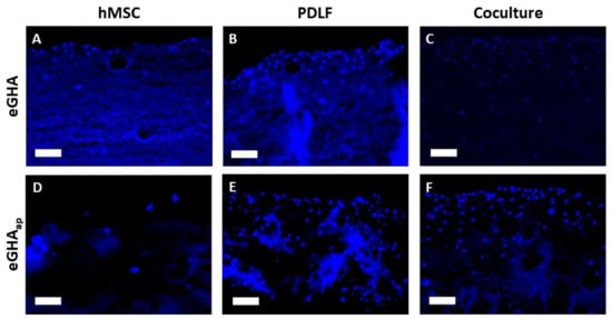 Representative cutouts of 4′,6-diamidin-2-phenylindole (DAPI) stained sections from eGHA and eGHAap nonwovens populated with hMSCs, PDLFs, or cocultures after an incubation period of 21 d. The upsides of the monoculture scaffolds are oriented towards the top of the picture. For the cocultures (C,F), the margins of the PDLF-populated downsides are shown. (A) hMSCs, (B) PDLFs, or (C) cocultures were grown on eGHA scaffolds. Cell nuclei are presented as blue dots, while parts of the nonwovens also show some background fluorescence. Accordingly, eGHAap samples populated with (D) hMSCs, (E) PDLFs, or (F) cocultures are presented, showing a tendency towards increased cell densities when compared to eGHA nonwovens. Scale bars represent 100 µm.