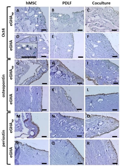 Immunohistochemical evaluation of eGHA and eGHAap scaffolds populated with hMSCs, PDLFs, and cocultures of both cell types. After an incubation period of 21 d, the constructs were fixed and incubated with primary antibodies against Oct4 (A–F), osteopontin (G–L), and periostin (M–R) and stained with the peroxidase-dependent 3,5-diaminobenzidine reaction (DAB; brown color). Subsequently, immunohistochemical staining for the mesenchymal cytoskeletal filament vimentin (HistoGreen staining; green color) was performed for all sections to detect all cells. Finally, hematoxylin counterstaining was applied. For each protein of interest, hMSCs (A,D,G,J,M,P), PDLFs (B,E,H,K,N,Q), and cocultures (C,F,I,L,O,R) grown on either eGHAap (A–C,G–I,M–O) or eGHA (D–F,J–L,P–R) were examined. The orientation of the representative pictures follows the same rules as in Figure 3. Staining results were evaluated visually and only qualitatively. (A,D) Oct4 was expressed mainly in hMSCs and detectable in only a few PDLFs (B,E). The inset in (D) represents a higher magnification of the section, illustrating the nuclear localization of Oct4. Osteopontin, a marker protein of hard tissues, was expressed predominantly in the nonwovens populated with cocultures (I,L). The periodontium-related marker periostin was found mainly in the cocultures (O,R) or PDLFs (N,Q), but barely in hMSCs (M,P). The white arrows in (A,B,D,F) exemplarily indicate positively stained cells, which are otherwise hard to recognize. Scale bars represent 100 µm.