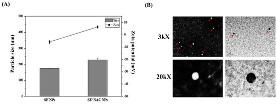 The particle size and zeta potentials of the SF/NAC NPs were measured using a dynamic light scattering particle size/zeta potential analyzer (Particulate Systems NanoPlus, Norcross, GA, USA). The SF/NAC NPs were suspended at a concentration of 0.05 mg/mL in DI water for further measurements [7,26]. The morphological images of SF/NAC NPs were carried out by a transmission electron microscopy (TEM) with an accelerating voltage of 100 kV (JEOL JEM-2000EX II, Tokyo, Japan) after they were stained with 2% (w/v) phosphotungstic acid and placed on copper grids [7,26].