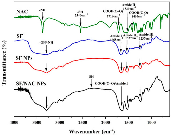 The functional groups of NAC and SF in the SF/NACNPs were determined using the ATR-FTIR spectra. The functional groups and the change in the characteristic peaks were determined by the decrease in the transmittance of the peaks (Figure 2). The characteristic peaks for the functional groups of NAC at 2546 cm−1 for the SH group and 1718 cm−1 C=O for carboxyl groups were consistent with the results of other studies [35]. The characteristic peaks in the spectra for the functional groups of SF were Amide I, Amide II and Amide III (e.g., 1237 cm−1) and were the same as those for SF NPs, which was in agreement with earlier studies [7]. The shift in the peak for Amide I for SF NPs from 1668 cm−1 to 1650 cm−1 for SF/NAC NPs might be due to chemical interactions between carboxyl groups (-COOH) in NAC and Amide I in SF. The shifts in the peak for Amide II in SF NPs from 1537 cm−1 to 1524 cm−1 for SF/NAC NPs were possibly due to the presence of Amide II in NAC (Figure 2). There was a minor peak at 2330 cm−1 for SF/NAC NPs, which was attributed to the SH groups in NAC, as reported by other studies [36].