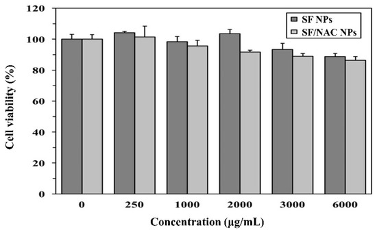 Cell viability studies for SF and SF/NAC NPs. The viability values (%) for the SF and SF/NAC NPs groups for concentrations of 0~6000 μg/mL were significantly (p < 0.01, n = 3, respectively) greater than 75%, the criteria for cytotoxicity evaluation of biomaterials of ISO10993-5. Hence, SF and SF/NAC NPs were biocompatible in these ranges.