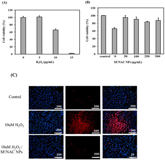 The cytotoxicity studies for SF and SF/NAC NPs gave similar results (Figure 3) and NAC was clinically used as an anti-oxidative drug, so the anti-oxidative effect of SF/NAC NPs was verified. The anti-oxidative ability of SF/NAC NPs was measured by calculating the viability of hBMSC and examining the MitoSOX red stains for cells after they were attacked by H2O2 at a specific concentration [26]. To determine the minimum concentration of H2O2 that was required to attack and reduced the viability of hBMSC cells, the cells were incubated with different concentrations of H2O2 and the results were shown in Figure 4A. In total, 10 μg/mL of H2O2 reduced the viability of hBMSC cells by 33% and 15 μg/mL of H2O2 resulted in about 100% death of the cells. Therefore, this study uses 10 μg/mL H2O2 to determine the anti-oxidative ability of hBMSC cells for different concentrations of SF/NAC NPs (Figure 4B).