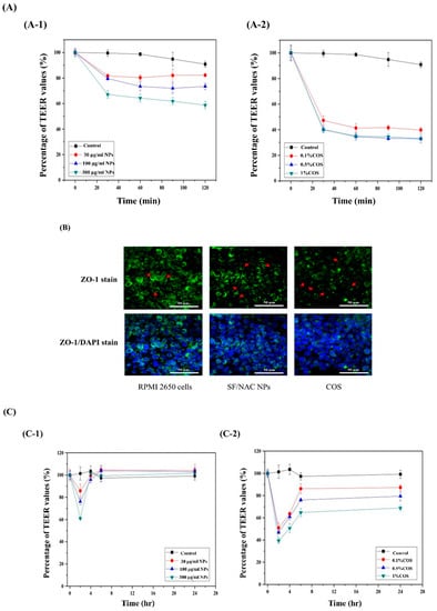 Figure 5A showed the dynamic decreases in the TEER values for different concentrations of SF/NAC NPs and chitooligosaccharide (COS), oligomers of chitosan with similar biological properties as those of chitosan [16,32], such as opening the tight junctions in the mucus cell layer that was used for comparisons with the NPs for RPMI 2650 cells that were incubated for 2 h. For the SF/NAC NPs group (Figure 5A(A-1)), the TEER value decreased to 81.7 ± 1.3%, 79.6 ± 1.1% and 67.1 ± 3.0%, (n = 3), as the concentrations of NPs incubated with RPMI 2650 cells increased (e.g., 30, 100 and 300 μg/mL, respectively) for 0.5h, so high concentrations of SF/NAC NPs might open more tight junctions in the cells. However, there were smaller decreases in the TEER values for the NPs group than for the COS group (47.3 ± 3.5%, 34.7 ± 2.6% and 30.0 ± 1.5% for 0.1, 0.5 and 1% COS, (n = 3), respectively.