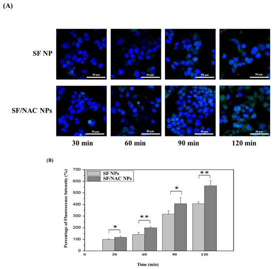 (A) Fluorescent images showing RPMI 2650 cellular uptake of fluorescent SF and SF/NAC NPs for a 2 h period, measured every 30 min. (B) The difference in the intensity of fluorescence for cells for the two NPs was significant (*: p < 0.05; **: p < 0.01, n = 4, respectively).