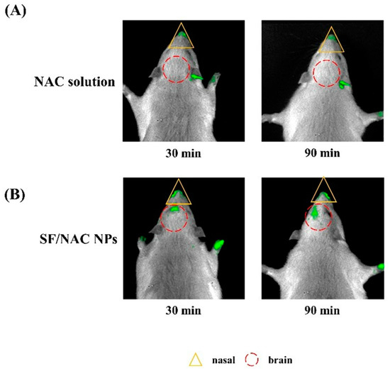 Male Sprague Dawley rats (300~350 g) were supplied by BioLasco Co., Ltd. (HsinChu, Taiwan). All in vivo studies were conducted in accordance with the guidelines of the Institutional Animal Care and Use Committee (IACUC) and approved by National Yang-Ming University [7]. The rats were anesthetized with isoflurane before nasal NAC was delivered using a micropipette [33]. For using IVIS study to determine the quantity of FITC-NAC or SF/FITC-NAC NPs that remained in nasal or reached brain regions of rats, 50 uL of FITC-NAC or SF/FITC-NAC NPs (300 µg/mL) in PBS was administrated into the nasal cavity of rats, and fluorescent images of the regions of interest (ROI) were captured at specific times using an optical instrument (Biospace Lab Optima, Nesles-la-vallee, France) for quantifications.