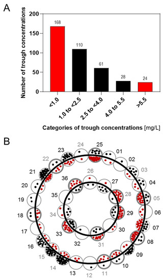 Descriptive analysis of Ctrough determined in children treated with voriconazole. (A) Results of therapeutic drug monitoring of voriconazole. (B) All voriconazole Ctrough obtained in one individual were rated for the data point being within the range of 1–5.5 mg/L (black dots, within range; red dots, outside range). Individuals without DNA available are labelled in grey. Individuals with >65% of the Ctrough out of range are highlighted by a broader circle line width.