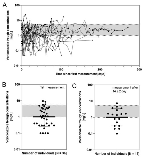 (A) Ctrough from therapeutic drug monitoring over time of all 36 individuals. (B) First measurement and (C) one measurement per patient after 14 ± 2 days of voriconazole Ctrough (n = 383; 8 Ctrough were excluded, because they were not measured within the same therapeutic intervention period). On the logarithmic scale of the y-axis, the therapeutic window of Ctrough between 1 and 5.5 mg/L is highlighted in grey.
