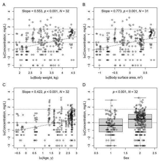 ln(Ctrough) correlated with (A) ln(body weight), (B) ln(body surface area), (C) ln(age), and, (D) differed significantly between female (f) and male (m) patients. The linear regressions of the correlations in (A–C) are indicated as broken line and slope with its level of p. p of a two-tailed homoscedastic t-test in (D). Horizontal dotted lines indicate the recommended range for Ctrough (1 to 5.5 mg/L). N, numbers of patients with available data and included in the plot.
