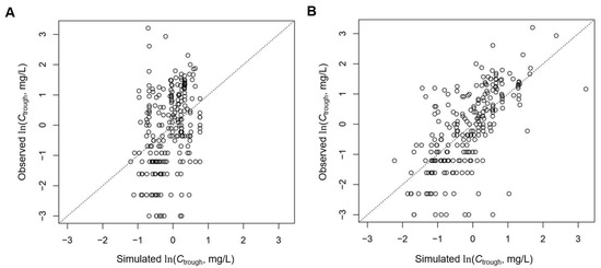 Observed ln(Cthrough) versus simulated ln(Cthrough). (A) Before inclusion of covariates for co-medications and genetic variants in the model. (B) Final model in Table 4. Both plots, population level (no random effects included).