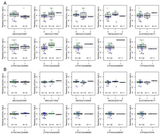 Distribution of the residues of ln(Cthrough) (observed − predicted) according to the genotypes of the individual patients. (A) Before inclusion of covariates for co-medications and genetic variants in the model. (B) Final model in Table 4. Both plots, population level (no random effects included). Box-and-whisker plots. Individual data points are superimposed in color. Blue, CYP2C19 rs4244285 GG genotype; green, GA; red, AA. 0, homozygous reference alleles; 1, heterozygous; 2, homozygous variant alleles.