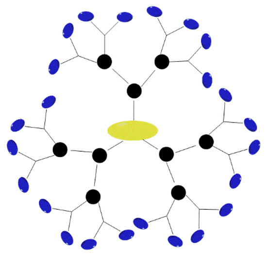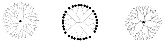Dendrimers are a form of macromolecular polymer with a tree-like structure and consist of three parts: a core, a branch unit, and a terminal group. In the low generations, these take the form of an open structure; while, in higher generations, they take on the form of three-dimensional spheres that are tight outside and loose inside. The unique function of these dendrimers is determined by their peculiar morphological structure. For example, these can be highly efficient drug delivery vehicles [54,55,56]. Drugs can be coated into the interior of these dendrimers or modified onto the terminal groups, to play a pharmacodynamic role.