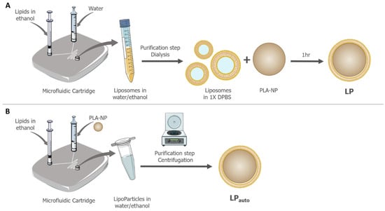 Preparation of LipoParticles (A) using the standard bulk method or (B) through an automated mixing using microfluidic system.