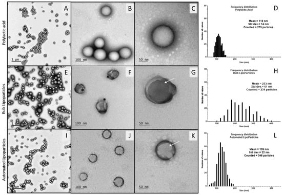 TEM images of PLA-NP (A–C), LP (E–G), and LPauto (I–K) stained with 1% (w/v in water) tungsten silicate solution. White arrows indicate lipid layers on LipoParticles (G,K), while black asterisks indicate eccentric lipid vesicles attached to LP (F). Size particle analysis was performed on 1 µm scaled images to evaluate the size distribution frequency of nanoparticles (graphs D,H,L). Scale bars are indicated on each micrograph.