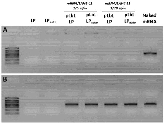The complexation of mRNA onto LP and LPauto was evaluated using an electrophoretic mobility shift assay. To this aim, a 1% agarose gel was prepared in Tris–borate–EDTA (TBE) 1× buffer, and ethidium bromide (EtBr) was added as staining. Formulations were either treated or not with heparin (Sanofi-Aventis, Ploermel, France) at RT for 30 min plus with proteinase K (NEB, Évry-Courcouronnes, France) at 56 °C for 15 min. The gel was then loaded with samples mixed with 2× loading dye (2× solution of 95% formamide, 18 mM EDTA, 0.025% SDS, xylene cyanol, and bromophenol blue; Invitrogen, Carlsbad, CA, USA) containing 100 ng of mRNA per well. The electrophoresis was performed for 17 min at 100 V, and the stained mRNA bands were visualized on an ultraviolet transilluminator and digitalized.