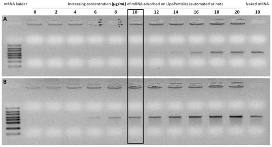 Considering that LPauto had a lower total lipid concentration than LP and that mRNA molecule complexation is directly correlated to the positive charges of cationic lipids, we then investigated whether lipid content could have an impact on the mRNA adsorption onto both LipoParticles. In this regard, increasing concentrations of mRNA were adsorbed onto each carrier, and an electrophoretic mobility shift assay was performed. As shown in Figure 4, the maximum mRNA immobilization capacity on the LP surface was reached when the free mRNA band corresponding to naked mRNA appeared on the gel. While it was possible to completely adsorb mRNA up to a concentration of 12 µg/mL with LP, the adsorbed amount was at least twofold lower with LPauto since a free mRNA band was visible from 6 µg/mL of mRNA.