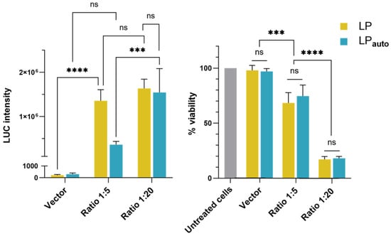 In the next step, we investigated the in vitro transfection efficiency of LP or LPauto complexed with 10 µg/µL of mRNA on DC 2.4 cells. As shown in Figure 5 (graph on the left), the transfection profiles were different between the two types of LP depending on the mRNA/LAH4-L1 ratio. A very efficient expression of mRNA was observed when pLbL formulations were prepared at a 1/20 w/w mRNA/LAH4-L1 ratio, even if it was significantly lower than the FLuc expression obtained with the commercial transfecting agent Lipofectamine 2000TM used as a control (data not shown). Furthermore, there was no significant difference between transfection realized with LP obtained via the bulk method or the microfluidic system at this ratio. However, when the amount of peptide in the formulation was decreased until an mRNA/LAH4-L1 ratio of 1/5, LPauto was significantly less efficient for mRNA transfection than conventional LP. While there was no significant difference observed between the 1/5 and 1/20 mRNA/LAH4-L1 ratio for LP, LPauto showed a reduced transfection efficiency when peptide loading in the pLbL formulation was decreased. Regarding cytotoxicity (Figure 5, graph on the right), both naked vectors were found to be safe on DC cells in contrast to the resulting pLbL formulations. The systematic cytotoxicity observed with pLbL formulations in DC2.4 cells was previously studied and was to be inherent to the LAH4-L1 peptide [25]. Thus, by reducing the peptide intake in the formulation from a 1/20 w/w mRNA/LAH4-L1 ratio to 1/5 w/w, cell viability was significantly improved from 17% to 69% and from 18% to 75% for LP and LPauto, respectively. It should be mentioned, however, that the pLbL formulations remained more toxic than the vectors alone.