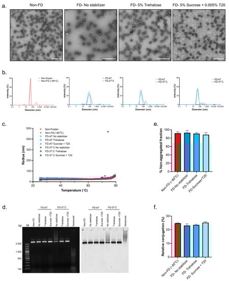 Transmission electron microscopy (Figure 2A and Figure 3A) and agarose gel electrophoresis (Figure 2C and Figure 3C) of the FD vaccines indicated that particle integrity was maintained following lyophilization and reconstitution. Additionally, the RNA content in the vaccines migrated through the agarose gel together with the protein components, indicating that the encapsulated nucleic acids were not expelled from the particles under vacuum. For both vaccines, the antigen remained covalently conjugated to the cVLP and did not dissociate or degrade during the freeze-drying process or the 2 months of storage (Figure 2B and Figure 3B). Additionally, no protein loss was observed following centrifugation of the reconstituted vaccines, indicating that the cVLPs were monomodal and remained in suspension. Thus, freeze-drying did not induce particle aggregation. This was further confirmed by DLS analysis where the average hydrodynamic radius and polydispersity of the FD-AT and FD-37 °C samples were equivalent and completely overlapped with the non-FD controls (Figure 2D and Figure 3D and Supplementary Table S4). Furthermore, the thermal stability of the reconstituted vaccines was assessed by DLS over the temperature range of 25–80 °C. Freeze-dried RBD-cVLP maintained the onset temperature of the non-FD vaccine (non-FD = 48.53 °C; FD-AT = 48.75 °C; FD-37 °C = 48.47 °C) (Figure 3E and Supplementary Table S5). However, remarkably, both FD and non-FD HAstem-cVLPs were stable up to 80 °C; thus, the onset analysis could not be performed for this vaccine (Figure S11).
