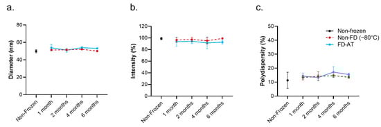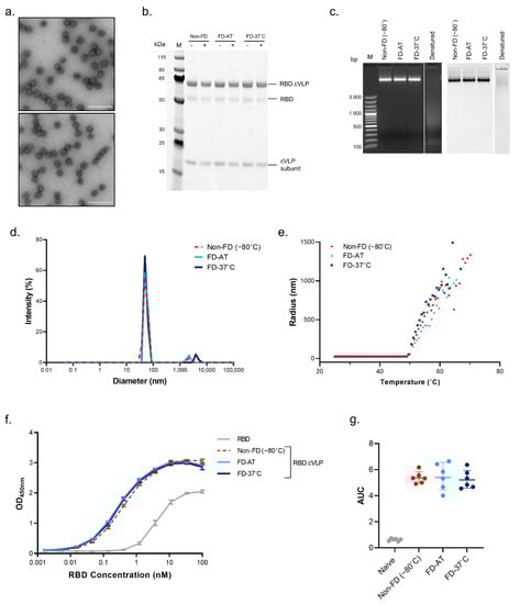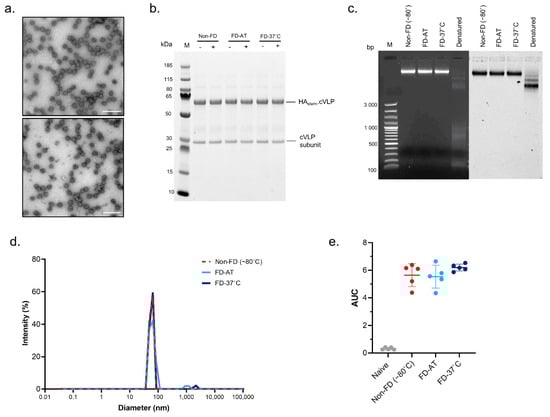 Aliquots of 500 µL (Catcher-cVLP and Tag-cVLP) and 200 µL (HAstem-cVLP and RBD-cVLP) were rapidly frozen in liquid nitrogen and then immediately lyophilized using a Hetosicc CD52.1 freeze-dryer for 24 h at 0.1 mbar and −60 °C. No desorption step was performed. Freeze-dried (FD) samples were stored at an ambient temperature of approximately 18–22 °C (AT) or 37 °C for up to 6 months and then reconstituted to the original volume with ultra-pure water.