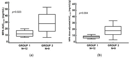 MPA-AUC0–12h absolute and dose-adjusted values were significantly higher in Group 2 (p = 0.04; p = 0.06, respectively) as shown in Figure 1a,b, and the ratio between median values were 1.88 and 2, respectively (Table 2). On the other hand, MPA Cl/F (L/h) in the Group 1 was higher than in Group 2 (p = 0.006) (Figure 1c).