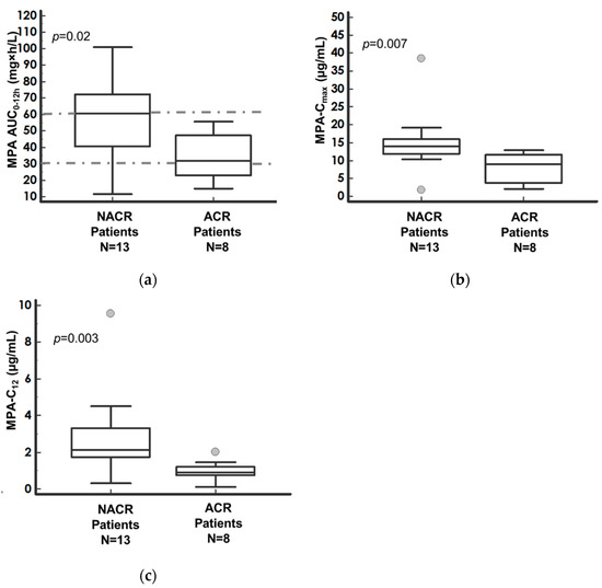 MPA-AUC0–12h median value in NACR patients was higher than in ACR patients (p = 0.02), as shown in Figure 3a, and the ratio between median values was 1.9 (Table 5). These results were also confirmed for the dose-adjusted parameter (Table 5). No statistically significant difference in MPA-C0 between the two groups of patients was found (Table 5). On the contrary, NACR recipients presented a higher MPA-Cmax (p = 0.007), as shown in Figure 3b, than ACR, and the ratio between the median values was 1.6 (Table 5). Significantly increased values were evidenced for MPA-C12h (p = 0.003), as shown in Figure 3c, and the ratio between NACR and ACR recipients was 2.4 (Table 5).