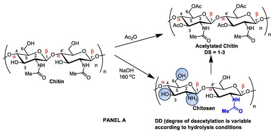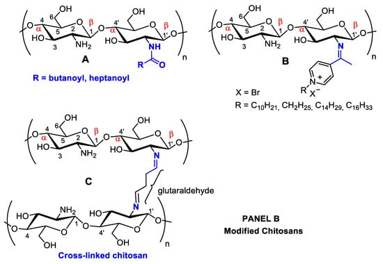 Panel (A): chitin and chitosan acetylation and deacetylation without alteration of the degree of polymerization. Chitin acetylation varies from 1–3 (DS = 1–3). Panel (B): chitosan structural modifications through amino group reactions with butanoyl or hepatanoyl (A), pyridine (B) or chitosan fibers crosslinking with glutaraldehyde (C).