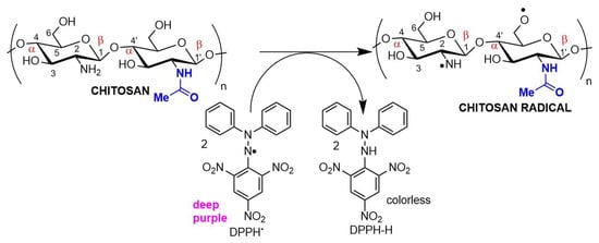 Antioxidant chitosan properties are ascribed to free amino groups, amino acetyl groups, and hydroxyl groups found in polymer molecules, all of which can react with different reactive oxygen (ROS) and nitrogen (RNS) species (Figure 3). Many studies indicate that chitosan polymers display antioxidant activities. However, the molecular mechanisms of chitosan radical scavenger abilities are still not well understood from a chemical point of view [39,40]. The antioxidant activity of chitosan increases with the degree of acetylation and with decreasing biopolymer molecular weight. It is important to note that shorter chains form fewer intramolecular hydrogen bonds between hydroxyls, resulting in more activated hydroxyl and amino groups, contributing to radical scavenging activity. Chitosan antioxidant activities can be identified by employing a very common antioxidant assay involving 1,1-diphenyl-2-picrylhydrazyl (DPPH) radicals. The DPPH radical exhibits a strong absorption band centered at about 520 nm and becomes colorless or pale yellow when neutralized (Figure 3). The ability to scavenge the DPPH radical by chitosan ranges between 30 and 60% [41].