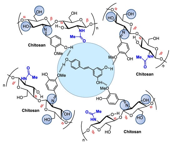 When associated with resveratrol (3,5,4′-trihydroxystilbene), a natural phytoalexin, chitosan synthesized in cis and trans isomers of grapevines in response to pathogen infection or physical injury can be administered either topically or systemically (Figure 4). Resveratrol owes its antioxidant activity to its phenolic hydroxyl groups and can be used to achieve oxidative skin cell homeostasis following topic use or aid in the fight against chronic and degenerative human physiopathological conditions by promoting organism oxidative balance when administered systemically as a nutraceutical or pharmaceutical [43].