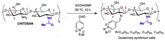 Chitosan antimicrobial activity can be customized and enhanced by covalently binding to antibiotics or antifungal agents to treat nosocomial infections. The introduction of radicals containing quaternary ammonium/pyridinium salts used as commercial antimicrobial agents (e.g., dimethyl dodecyl ammonium chloride or bromide and cetylpyridinium chloride) can improve antimicrobial activity (Figure 5). For example, chitosan nanoparticles modified through the formation of a Schiff base in the amino group, forming long-chain pyridinium radicals, exhibited increased antibacterial activity against the Gram-positive species Staphylococcus aureus and Bacillus cereus, as evaluated by MIC (minimum inhibitory concentration) and MIB (minimum bactericidal concentration), as well as mild antioxidant effects (Figure 3) [56].