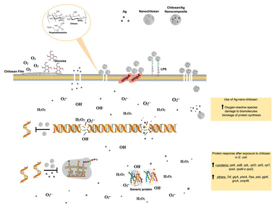 Molecular effects of chitosan nanoparticles on E. coli growth inactivation. Chitosan seems to interact with phospholipids, particularly phosphatidylethanolamine (PE), the most abundant phospholipid in E. coli, triggering the impermeabilization or disassembly of its outer membrane. The impermebialization of bacteria membrane by the nano-chitosan films inhibit glucose and O2 uptake, causing bacteria death. After exposure to nano-chitosan particles, E. coli experiences a differential expression of proteins involved in protein biosynthesis machinery and amino acid and purine nucleotide supply, as already demonstrated [38] and shown in the yellow rectangle at the lower right corner. When E. coli is exposed to Ag-nano-chitosans, an increase in reactive oxygen species is observed, followed by consequent damage to cellular structures, including proteins and nucleic acids. Chitosan and Ag nanoparticles, as well as cellular structures, are not represented in their real scale. This figure was drawn using the infographic maker Mind the Graph, available at https://mindthegraph.com.