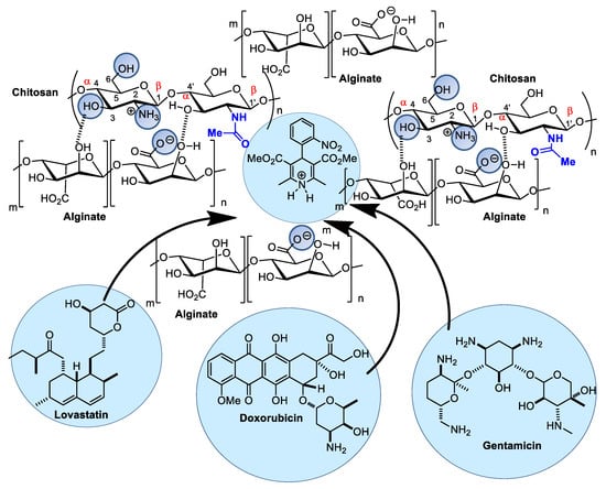 Alginic acid and alginate are polysaccharides of variable molecular masses composed of two monomers in a 1-4 linkage between α-L-guluronic acid and β-D-mannuronic acid found in the cellular structures of certain bacteria and brown seaweeds. Both monomers are uronic acid derivatives. They can form salts with different metallic cations and colloidal or gelatinous solutions in aqueous media at an adequate pH, making these biopolymers suitable for use in cosmetic, cosmeceutical, and pharmaceutical formulations. In pharmaceutics, alginate nanoparticles can be combined with other polymers, forming supramolecular interactions employed as drug delivery systems. These polymer associations display several advantages in drug encapsulation. Alginate/chitosan nanocapsules can accommodate hydrophobic molecules presenting different molecular weights and structural scaffolds [80,81,82]. Some examples are highlighted in Figure 7, which illustrates the interactions of several drugs with chitosan/alginate nanocapsules. A significant example related to wound healing comprises a nanofibrous alginate/chitosan dressing containing gentamicin. This fibrous material displayed high antibacterial performance superior to that of gentamicin alone associated with improved wound adhesion, cell proliferation, and wound regeneration when tested on Balb/C mouse skin [65,83]. Another hydrophobic compound, the antihypertensive nifedipine, was efficiently nanoencapsulated in sodium alginate:CaCl2:chitosan with a mass ratio of 30:6.7:3.2 (w/w/w). These biopolymer associations were shown to be efficient in rapid in vitro release, followed, as expected, by a controlled release. More recently, alginate/chitosan nanoparticles were used as a carrier for lovastatin and analyzed by Fourier transform infrared spectroscopy (FT-IR), scanning electron microscopy (SEM), laser scattering, and differential scanning calorimetry (DSC) [84]. Spectroscopic data indicate that hydrogen bonds and dipolar–dipolar interactions between lovastatin and alginate/chitosan nanoparticles occur inside these spherical nanocapsules. The melting temperature of alginate/chitosan/lovastatin nanoparticles was higher than that of chitosan and lower than that of alginate separately. The drug release process also involved a rapid release stage followed by a slow release stage. Alginate and chitosan can also substitute nanoliposomes to carry antineoplastic drugs such as doxorubicin, which binds to DNA-associated enzymes by intercalation in DNA base pairs. Alginate-chitosan-doxorubicin nanocapsules exhibited a superior cytotoxic effect on multidrug-resistant lymphoma cells (L5178 MDR1) but reduced cardiotoxic effects on H9c2 cardioblasts in culture [84].