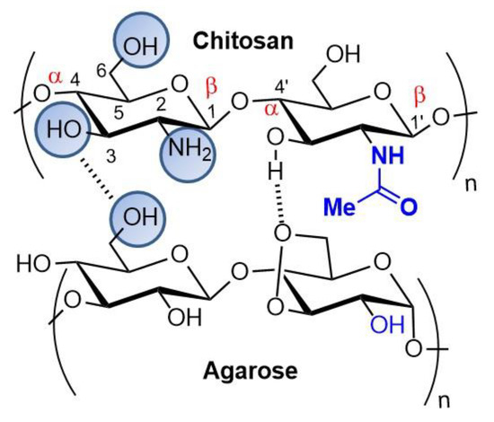Functional chitosan and agarose composites, as well as linear and stable chains of polysaccharides, extracted from marine red algae composed of alternating units of β-D-galactose and 3,6-anhydrous-L-galactose, can be built, and the ratio of each polymer confers different composite properties according to the desired application. The polysaccharides are similar in their three-dimensional structures and are capable of hydrogen bonding (Figure 8) [85,86]. Due to its predominantly hydrophilic and macroporous structure, agarose can form gels similar to some human tissues, and chitosan-agarose composites exhibit excellent mechanical properties coupled with superior antibacterial activities relative to those of pure chitosan structures [87].