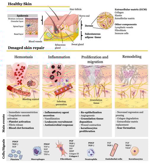 - Rodrigues, M.; Kosaric, N.; Bonham, C.A.; Gurtner, G.C. Wound Healing: A Cellular Perspective. Physiol. Rev. 2019, 99, 665–706. [Google Scholar] [CrossRef]