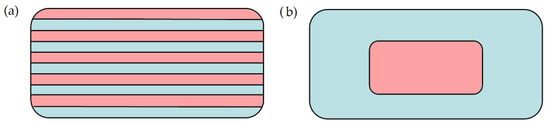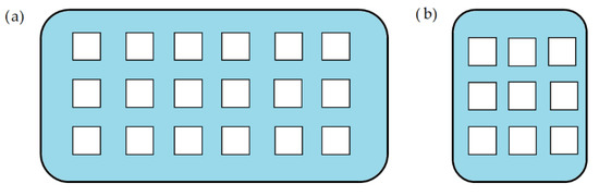 Cross-section of the 3D-printed channeled tablets. Each white square represents a channel. (a) Channels parallel to the longer side; (b) channels parallel to the shorter side [52].
