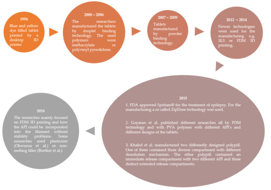 In the same year, Sadia et al. decided to use a pharmaceutical-grade non-melting filler (TCP) through the hot-melt extrusion to allow a consistent flow from the nozzle of the printer. This novel approach meant the addition of 20–50% non-melting component to the filament and four model drugs were incorporated separately. This process aimed at the fabrication of well-defined caplets. In the case of 5-ASA and prednisolone, 93% of the drug contents remained intact in the tablet but a significant drop in captopril content was observed due to thermal degradation. This procedure made the manufacturing of personalized immediate release tablets easy [40]. In Figure 5. the most important research results can be seen between 1996–2016.