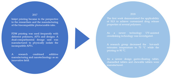 In the same year a high—up to 60 w/w%—API-containing filaments were designed by TPU polymers and a prolonged release profile was achieved with a time period of 24 h. High drug loaded filaments were fabricated which were heat stable through the FDM 3D printing [54]. In Figure 9. the most important research results can be seen between 2017–2018.