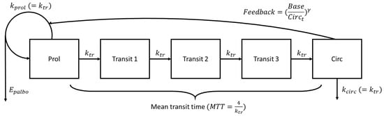 Semi-mechanistic PK/PD structural model describing neutropenia after palbociclib administration [18]. : palbociclib effect parameter described by an Emax model, : net proliferation rate constant, : transit rate constant, : physiological neutrophil elimination rate constant from systemic circulation, MTT: mean transit time through the maturation delay chain, Prol: proliferating progenitor cells, Circ: circulating cells, Base : baseline value of circulating cells, : circulating cells at a given time t, γ: power factor for the feedback mechanism.