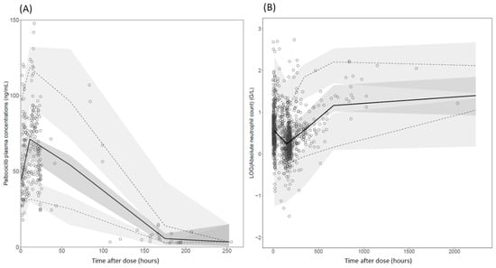 The following supporting information can be downloaded at https://www.mdpi.com/article/10.3390/pharmaceutics14071317/s1: Figure S1: Normalized observed palbociclib plasma concentrations-time profiles. Concentrations are normalized for a daily dose of 125 mg. Concentrations from patients with rich sampling are joined with black lines, Figure S2: Goodness-of-fit plots of the final model for palbociclib concentrations (A) and ANC time course (B). Loess smooth curves are printed in grey. (a) Observed concentrations vs. individual predictions; line of identity is printed in black. (b) Observed concentrations vs. population predictions; identity line is printed in black. (c) Conditional weighted residuals (CWRES) vs. population predictions; ordinate value zero line is printed in black. (d) CWRES vs. time post-dose; ordinate value zero line is printed in black, Table S1: Parameter estimates of the final palbociclib PK-only model with bootstrap results, Table S2: Results from the Cox analysis.