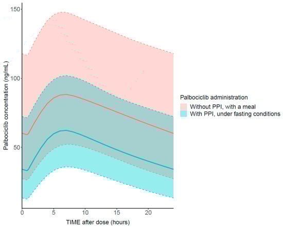 Simulations based on the final PK model in 1000 individuals per group allowed the comparison of palbociclib disposition after administration during a meal without PPI or in fasting conditions with PPI.