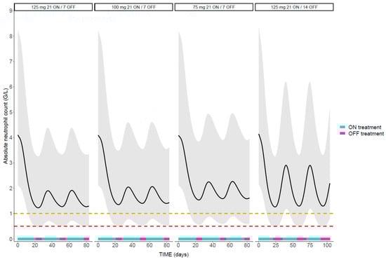 Model-based simulations of ANC dynamics following 3 cycles of different palbociclib dosage regimens (125, 100, or 75 mg, and 7- or 14-days OFF-treatment periods). The orange and red dotted lines represent the ANC threshold for grade 3 and 4 neutropenia, respectively. The black lines represent the population median prediction, and the shaded areas show the 95% prediction intervals.