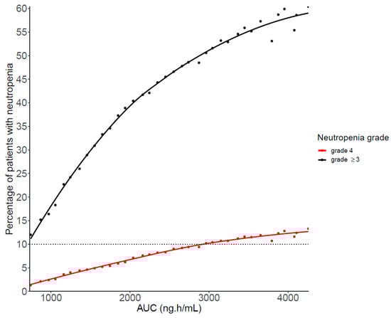 The risk of experiencing high-grade neutropenia increased with AUC0-24, as exemplified in Figure 5. Targeting an AUC0–24 lower than 2900 ng·h/mL would limit the risk of developing grade 4 neutropenia to 10%.